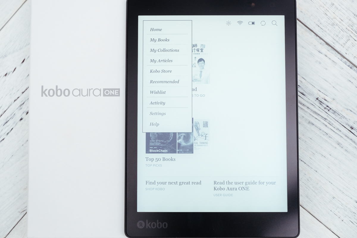 Kobo aura ONE 電子書閱讀器的首頁預設會是顯示你近期讀過的書以及目前 Top 50 的書籍。