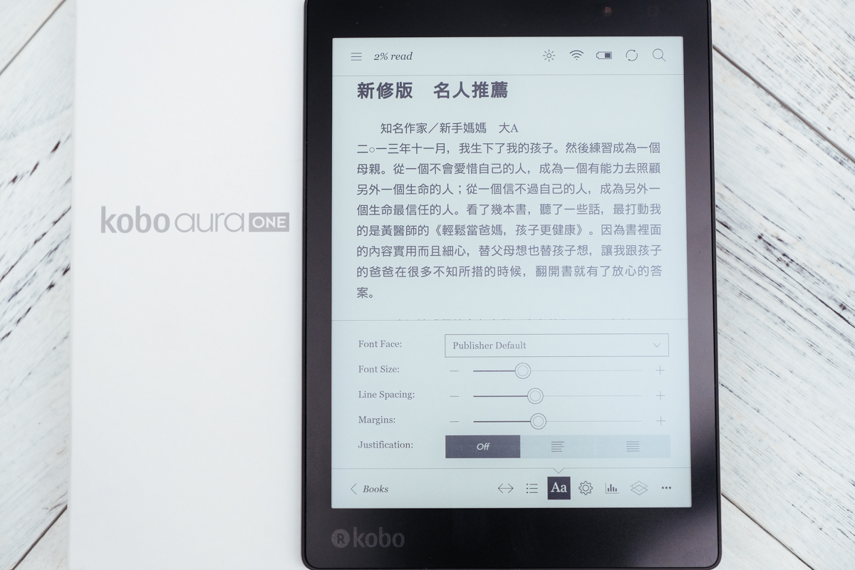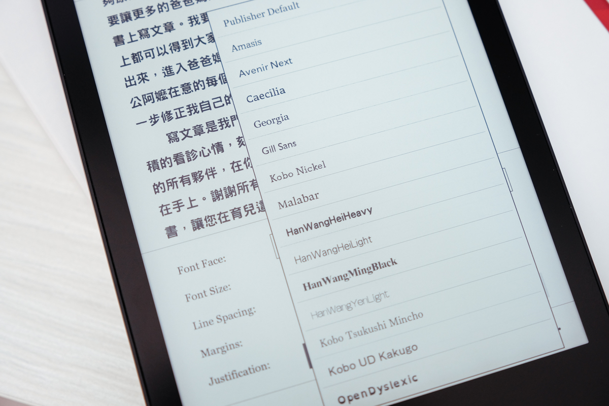 下方可以針對喜歡選擇字型、大小行距、字距等,哦對了,雖然 Kobo aura ONE 電子書閱讀器支援繁體中文書,基本上中文字都會正常顯示,不過這主要應該是套用日文的字型來顯示漢字,也因此會有部份中文字無法正常顯示,阿湯在後面也會和大家分享怎麼解決中文相容問題。