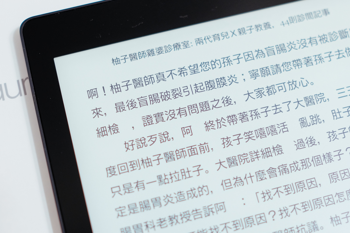 透過這種 E Ink 電子書螢幕來閱讀文字真的就像在看真的書本一樣,不會像平板有亮度且螢幕會有些微的格狀紋(仔細看的話),看久眼睛很容易疲勞,E Ink 電子書螢幕就舒適許多,而且文字會非常的清晰。