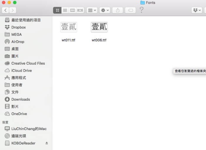 然後將你自己的中文字型(僅支援 .ttf 字型檔)放到 Fonts 資料夾裡,退出磁碟後將 Kobo aura ONE 重新開機即可)。