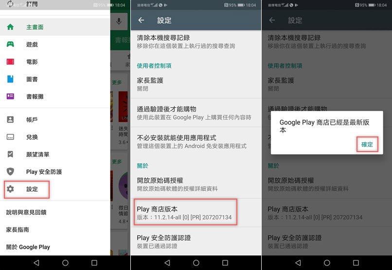 步驟很簡單,開啟 Google Play 首頁點左上角進入設定,往下拉到 Play 商店版本,按下去,如果不是最新版本就會幫你更新,並在完成後收到通知。