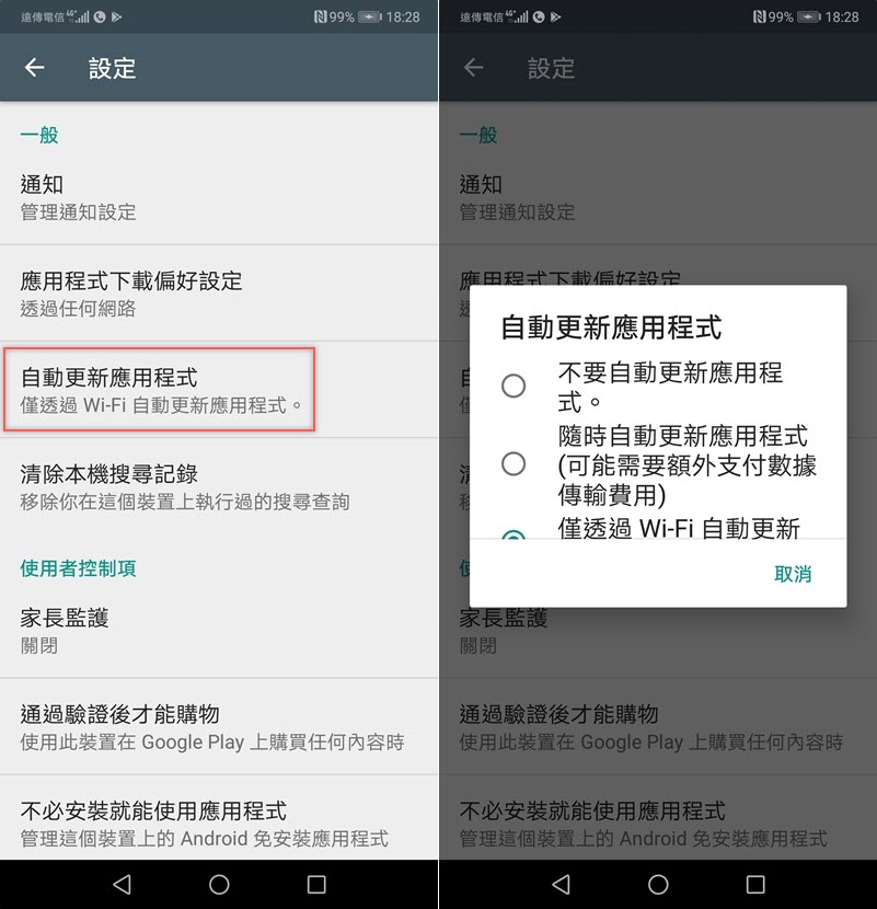 看到標題,阿湯知道更多人是想知道怎麼關閉「APP 的自動更新」,也很簡單,一樣進入設定看到「自動更新應用程式」,你會有三個選項:不要自動更新、隨時更新、僅透過 Wi-Fi 自動更新,如果不是吃到飽用戶,建議選第三項就不會吃到傳輸量。