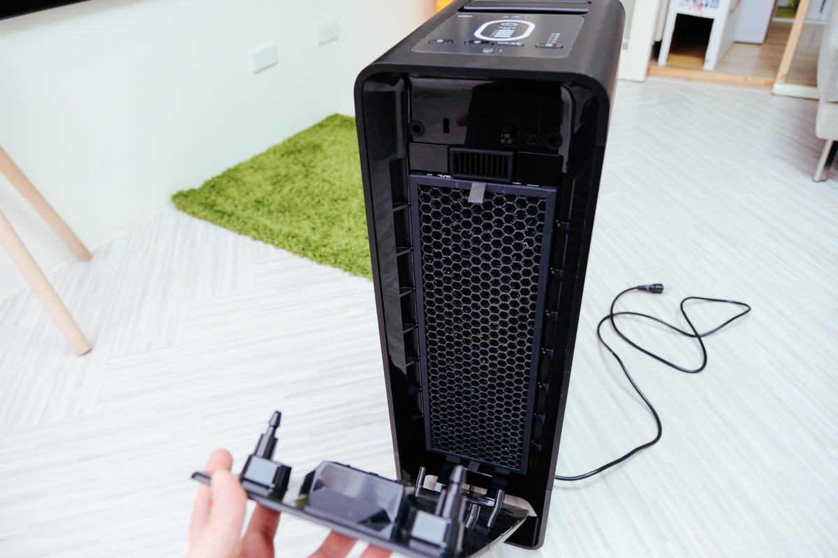 前方為空氣排出的方向,這裡打開後看到的是第二層的 VOC 顆粒活性碳濾網,可以有效濾除 99% 甲醛及其他揮發性有機化合物、家用異味。因此如果是家中剛裝潢完不久一直有聞到臭臭刺鼻的甲醛味就該買一台回去 24 小時開著清淨一下了。