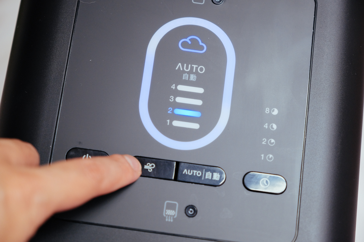 一共有四節風速可以手動調整,可依當下環境需求自己調整,或者直接選擇 AUTO 智慧偵測模式,讓 SensorAir空氣清淨機自行偵測空氣品質並自動調節運轉風速。