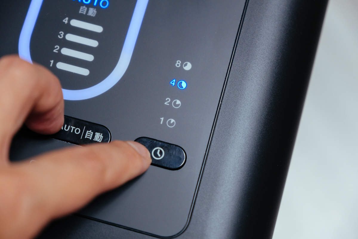 有些人空淨機都是用在睡眠時間,或者在家不想要運轉那麼久的話,可以透過這自動定時關機按鍵來設定,一共有四段 1/2/4/8 小時可以切換選擇。