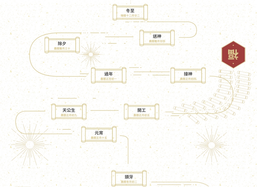在首頁往下滑動網頁,就可以看到有個拜拜流程圖,幫你從最早開始拜拜的日期一直往下安排,往後你只要照這順序走就可以了。
