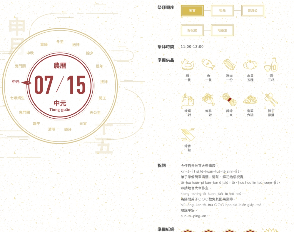 進入拜拜基本款的首頁,阿湯還沒看過這麼精緻有質感的「民間習俗」相關網頁,做的實在太好了,右上角會顯示當日的農曆日期、國曆日期以及當下的時間,以便讓你可以對照。