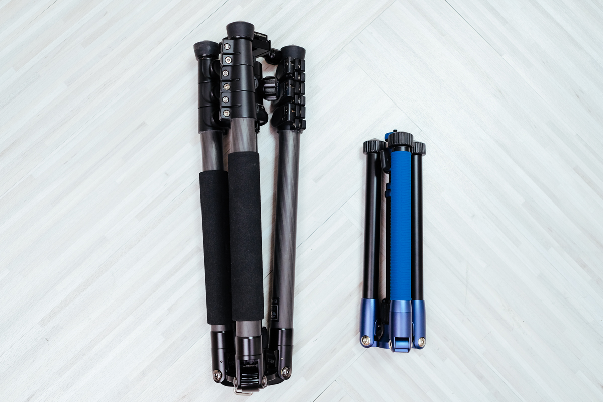 左邊是原本阿湯手邊最輕的腳架,不過也重達 1.7kg,之前出國旅遊帶一整路我都快往生了,再加上背包一堆有的沒的,真的差 1kg 都會相當有感。