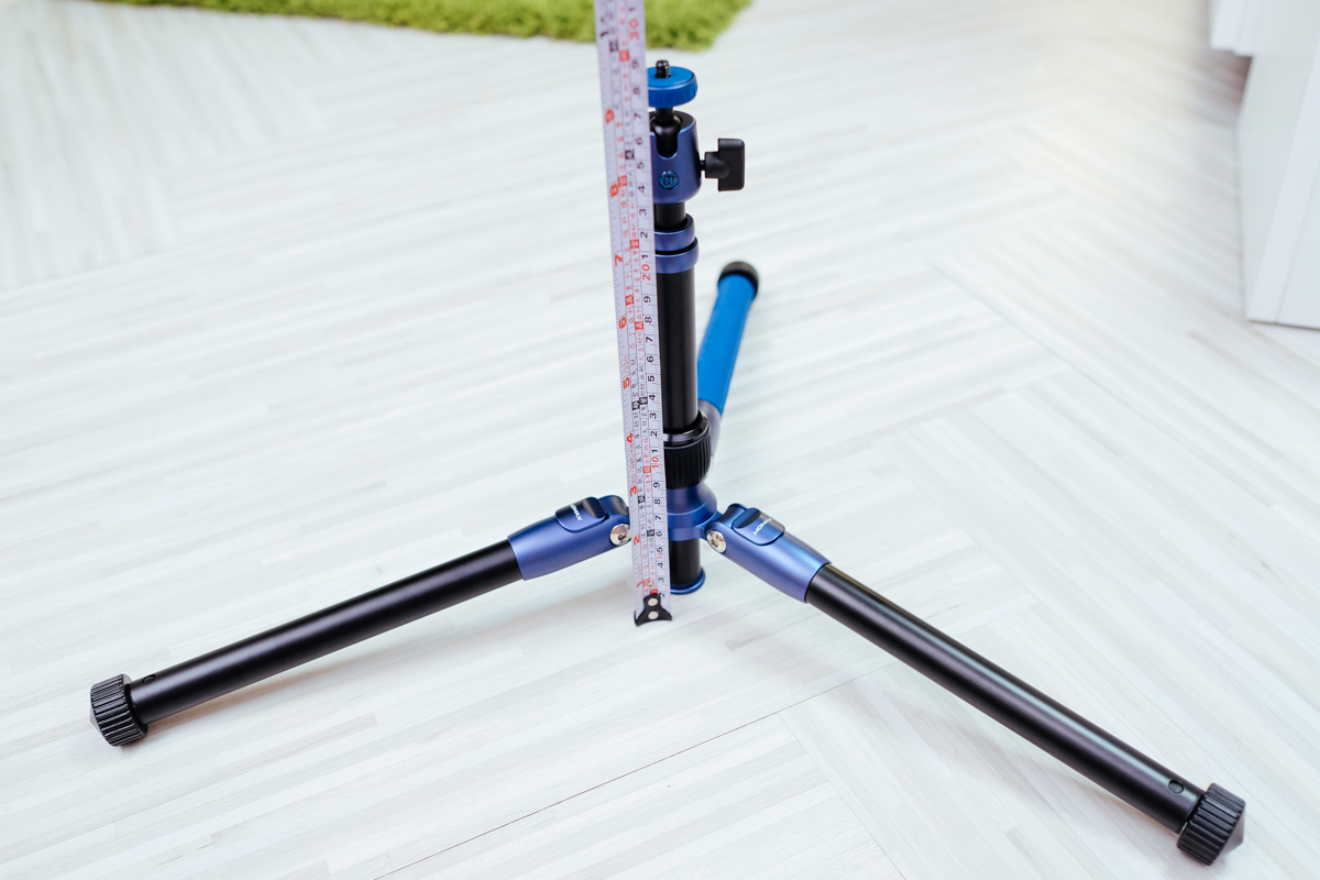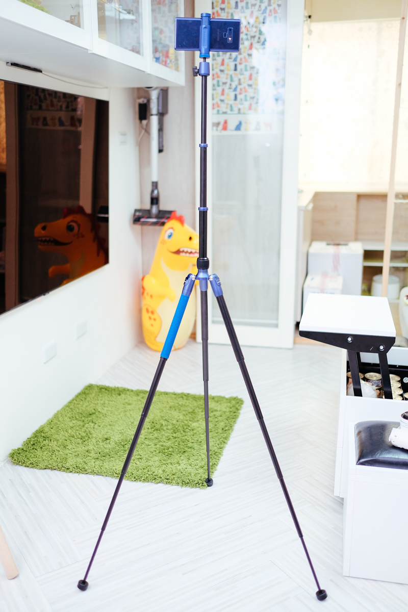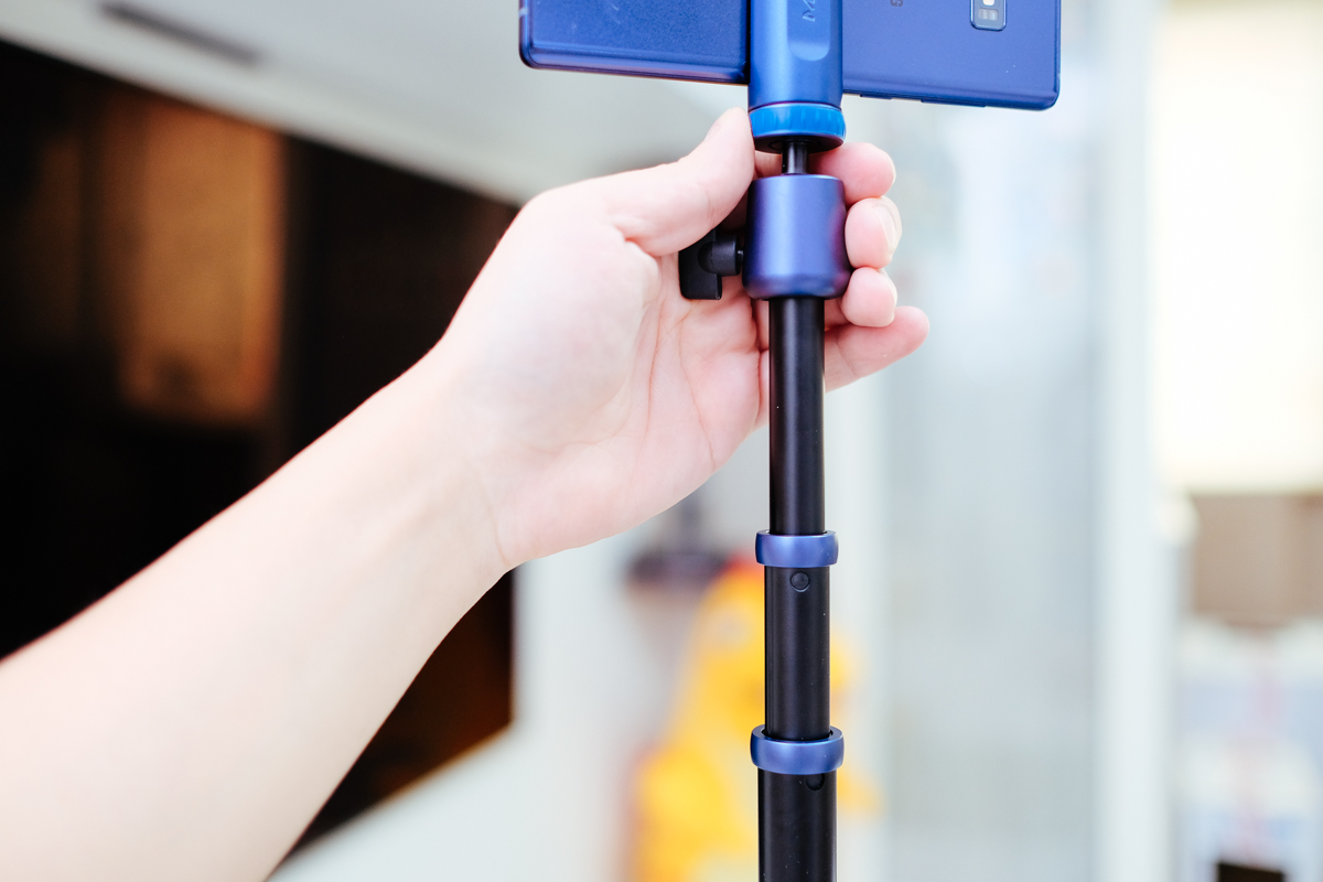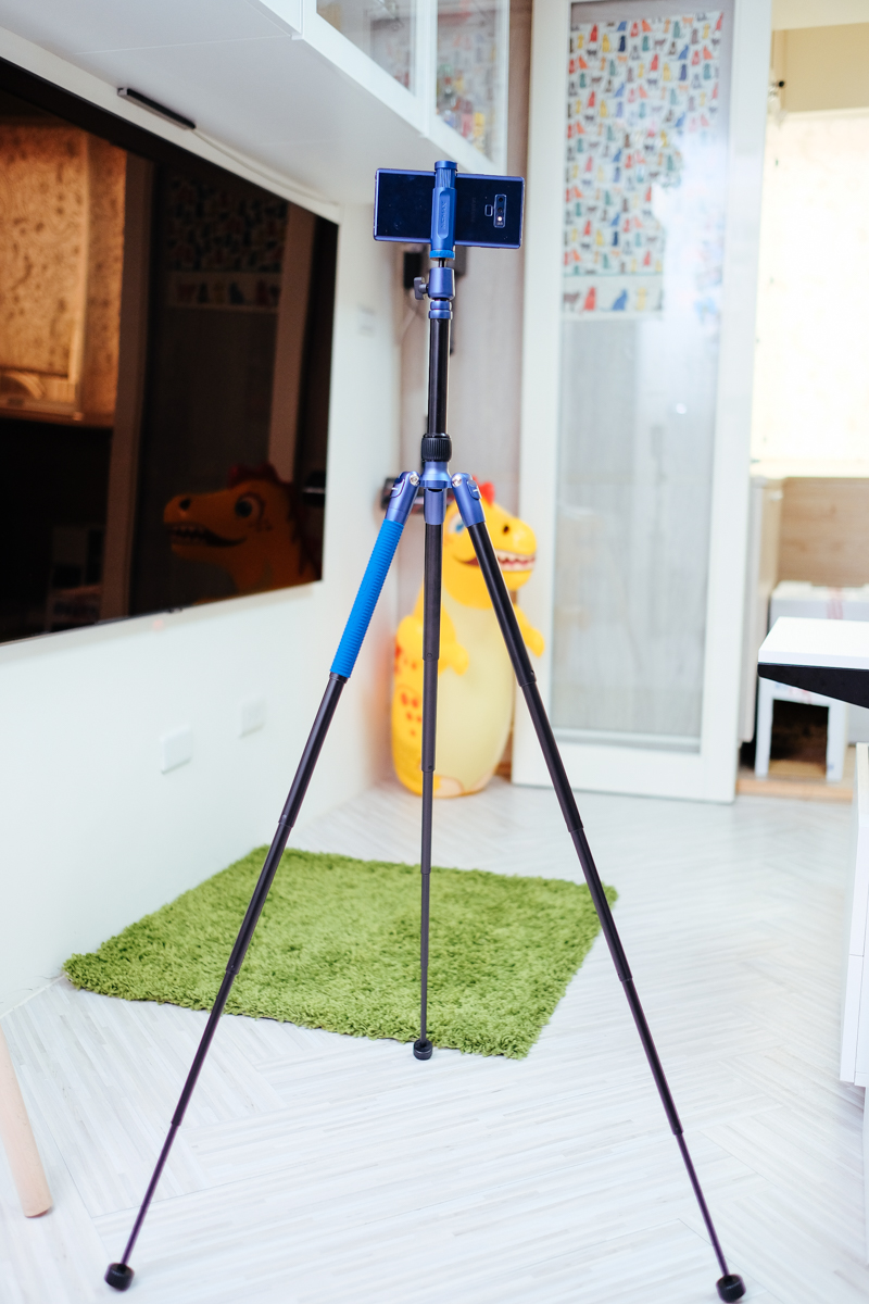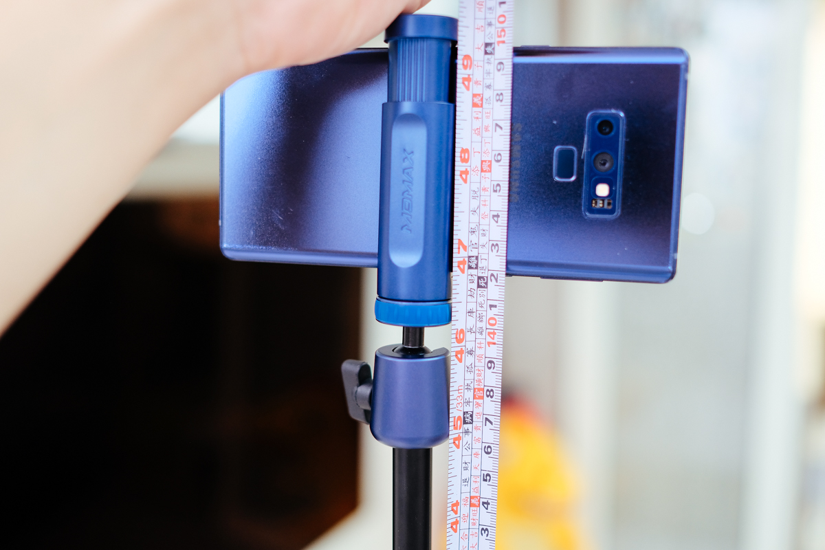 全部展開的最高高度為 140cm,以手機鏡頭的位置來說(Note 9)大約是 146cm 左右,看你手機鏡頭的位置,這高度已經是大部份運用腳架時的常用高度了。