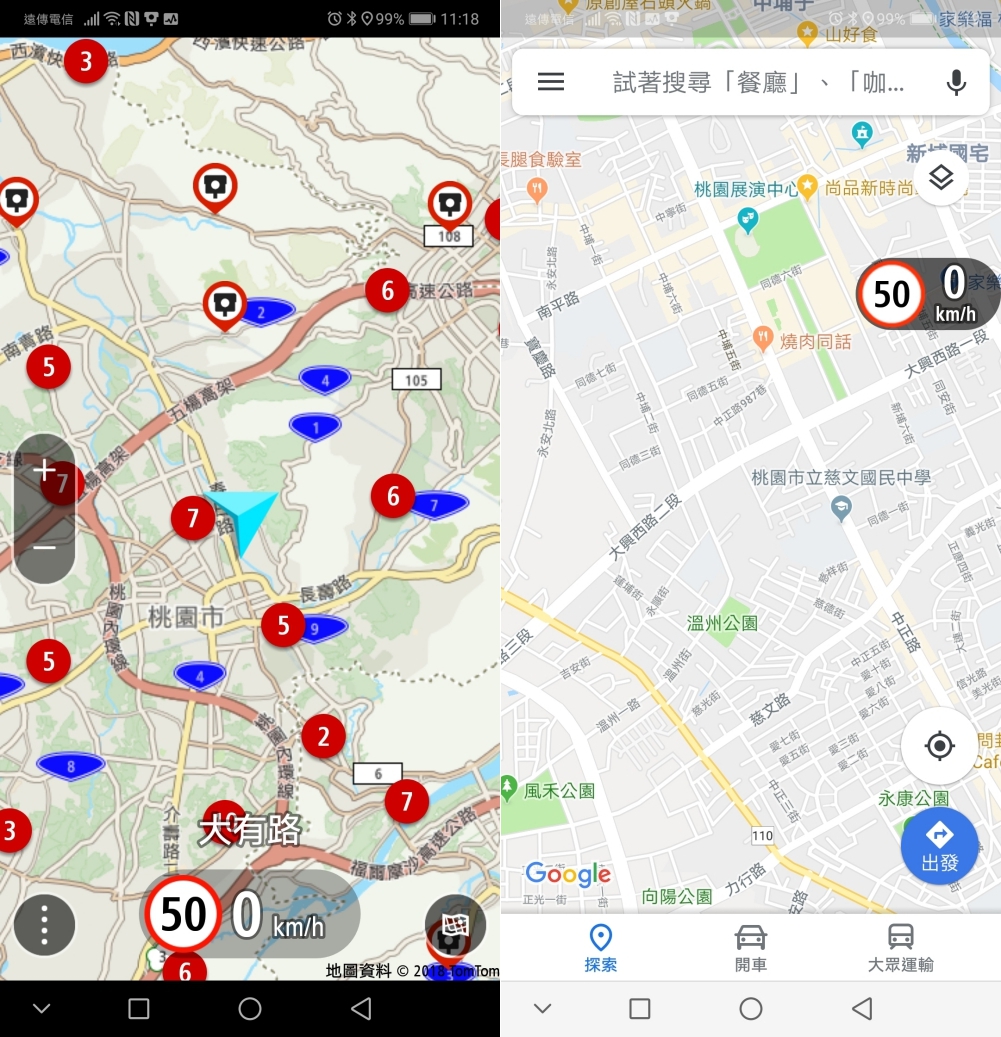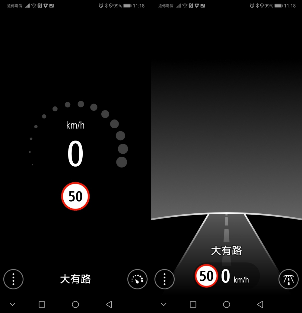 像這是單純顯示速限跟速度模式,以及右圖是加上道路資訊。