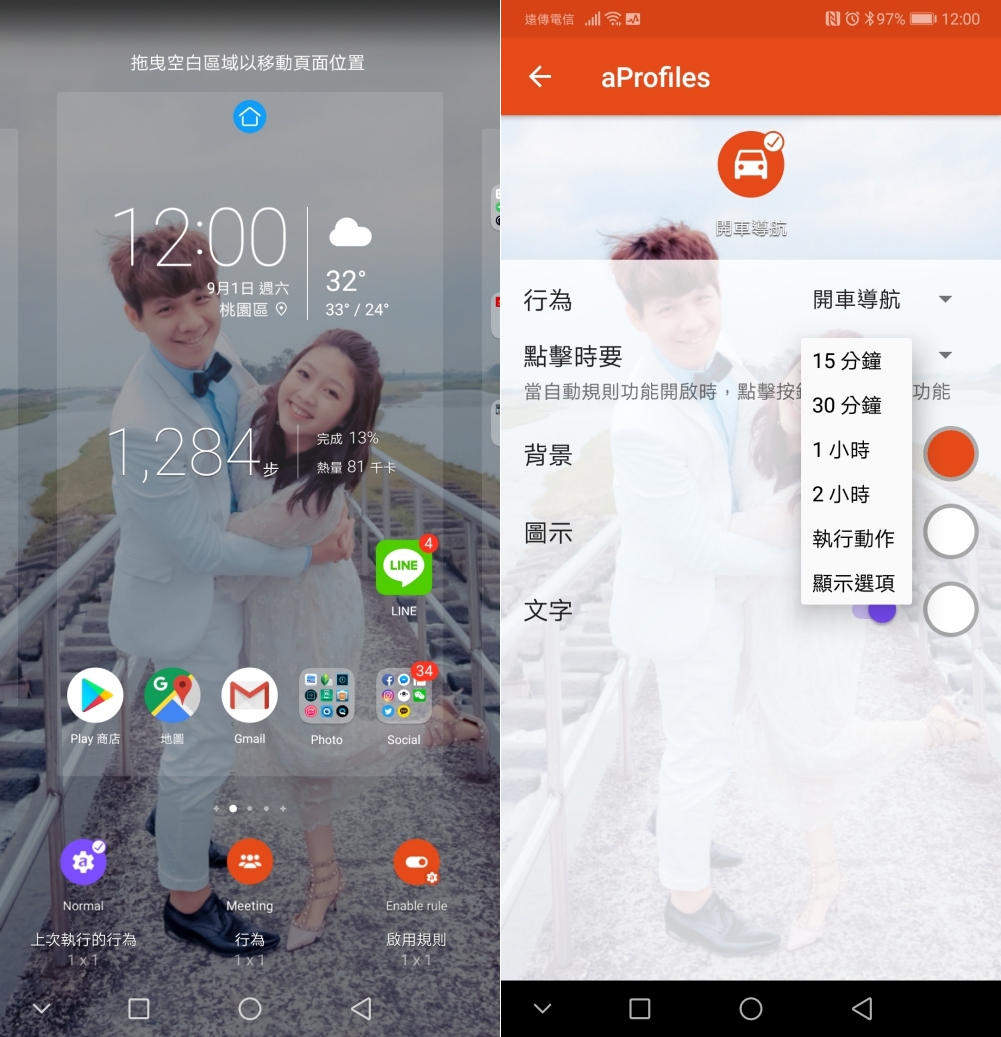 首先新增小工具,在 aProfiles 裡選擇「Meeting 行為」 這一個小工具,跳出設定畫面時,行為就選擇剛剛建立的那一個(比如我的是開車導航),點擊時要做的動作選擇「執行動作」,然後退出該畫面。