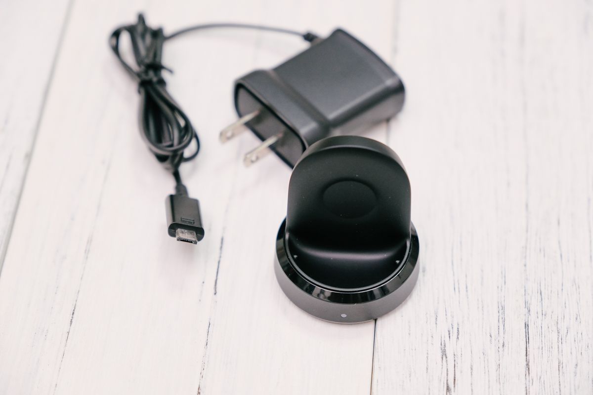 就不要太拐彎抹角,直接來看看 Samsung Gear Sport 的內含物吧,包括充電變壓器、無線充電座(錶用)、保固卡及簡易手冊,而錶帶的部份則是額外附有一條較短的版本,是給手較小或女生使用的,不過錶帶採用的是通用尺吋,因此市面上的錶帶也都能替換使用沒問題。