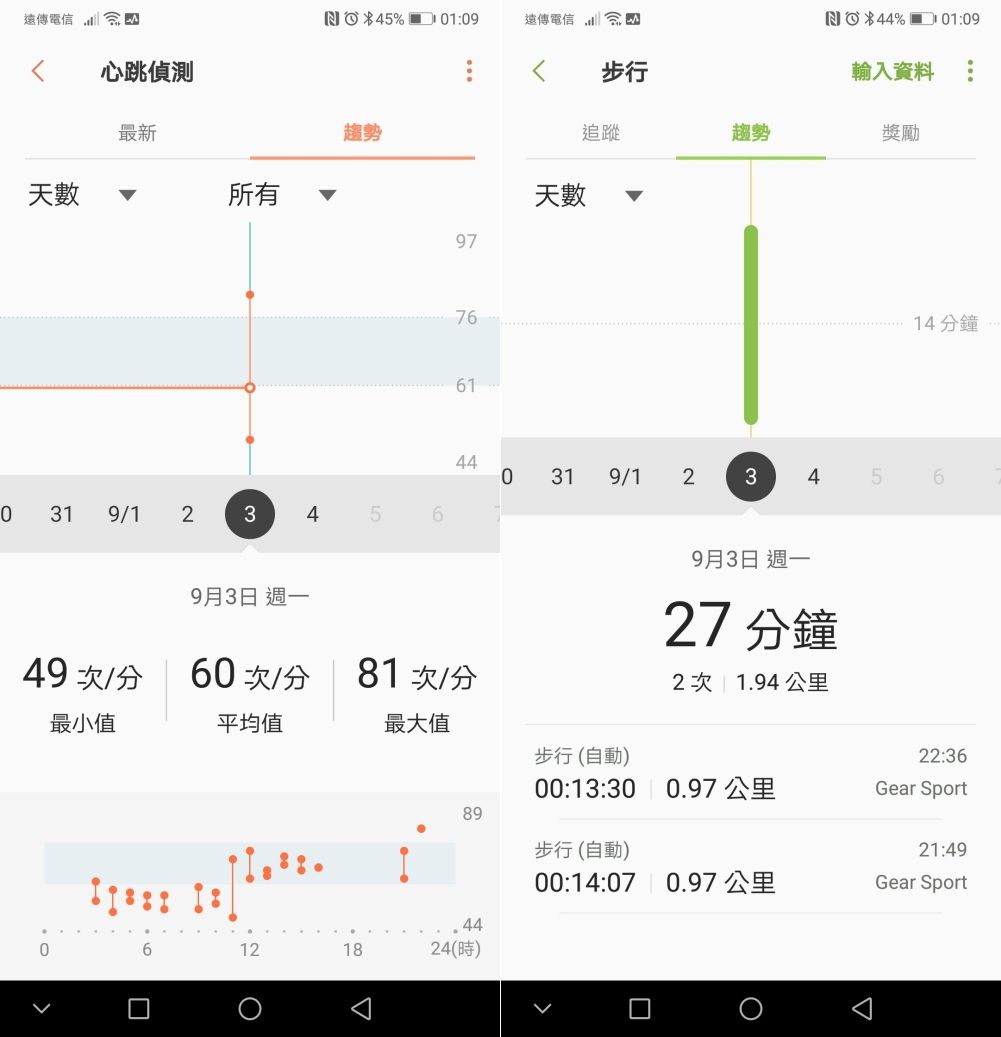 搭配 Samsung Health 方便記錄更多量測的資訊,像是每天走路的時間步數、跑步的時間、睡眠時間、心跳偵測記錄等,可以在這裡看的分析資料非常的多。