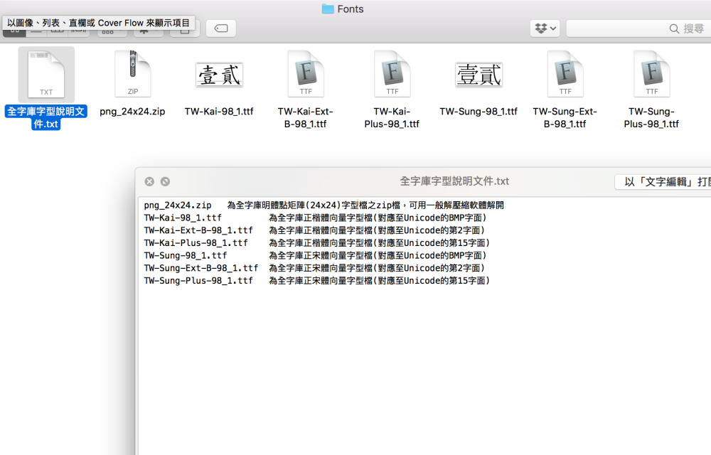 裡面包括的字型除了正宋跟正楷體之外,後面有標註 Ext-B 跟 Plus 的主要是差在字體粗細的樣式,你就想像成是粗中細三種規格共六個檔案。