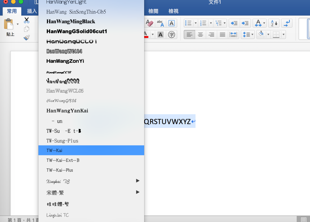 在 Windows 裡安裝後字型名稱顯示會是正常的中文,不過在 MacOS 的 Office 裡是顯示英文,找到 TW 開頭的這一堆就是了。