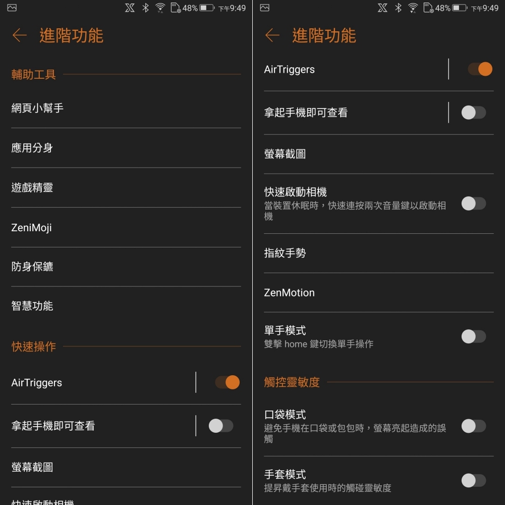 其他還有更多在華碩的手機中原本就內建的實用功能,像是網頁小幫手、應用分身、ZeniMoji、防身保鑣等,還有相關手勢操作等設定,都可以在進階功能中找到。