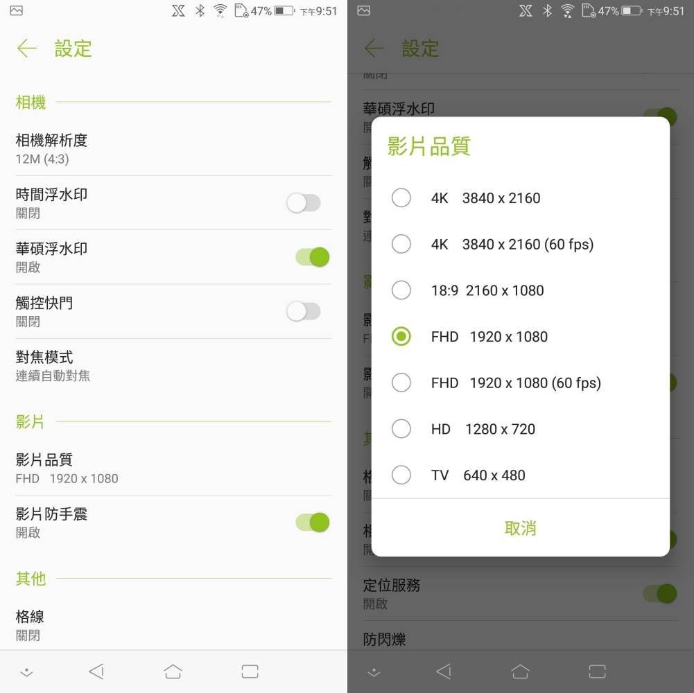如果想要有 ROG 玩家共和國的浮水印,可以到設定中開啟華碩浮水印,另外錄影的品質可達 4K 60fps,非常的驚人,且不用擔心錄影熱當的問題,ROG Phone 散熱非常強,畢竟是電競手機啊!字典裡沒有熱當這二個字啊。