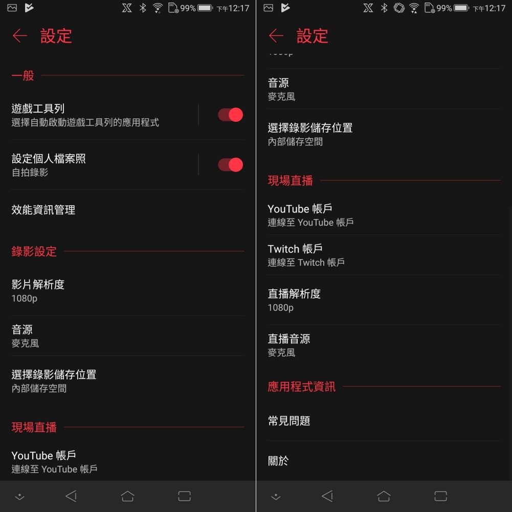 遊戲直播最高可以設置 1080p,可以直接連接到 YouTube 或 Twitch 帳戶使用,遊戲直播主應該很喜歡手機有內建這樣的功能,不用再透過 OBS 相關軟體。