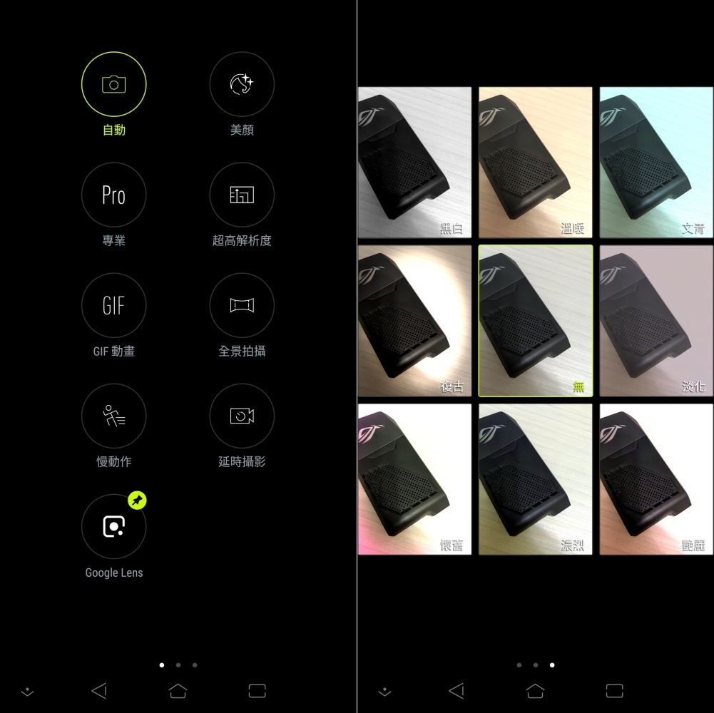 功能的部份包括美顏模式、即時人像景深、專業、全景等,往右滑的濾鏡功能中包括八種預設濾鏡可以使用。