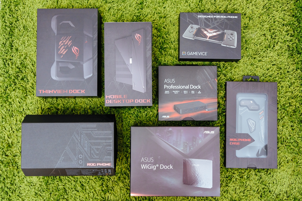 - ROG 全配件:TwinView 雙螢幕基座(8990 元)、ROG Phone 專屬保護殼(1490 元)、GameVice 遊戲控制器(2990 元)、Type-C 五合一擴充底座(2990 元)、Mobile Desktop Dock桌上型遊戲基座(4990 元)、WiGig 無線投影底座(7990 元)、ROG Phone限定登機箱(4990 元)。