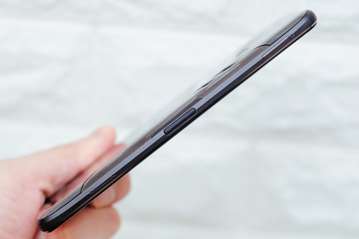 說到 ROG,配色不離紅與黑,當然 ROG Phone 的整體配色也是如此,而背蓋的部份這次為幻影黑,並有著「AURA 燈光效果」的 ROG Logo,而且這次光是背面的製程就相當的費工,包括了3D 玻璃異形切割背蓋、多層光學鍍膜以及五道絲印並搭配電漿銅跳色設計,這都是 ROG 系列追求極致的成果。