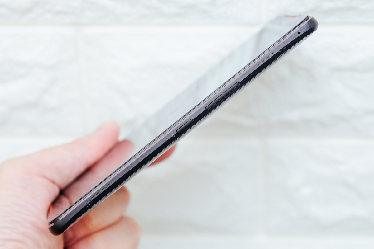 喇叭置於手機上下,當橫使用時剛是左右立體聲道,而這雙前置揚聲器是採用五磁鐵喇叭並搭載雙 NXP 9874 Smart AMP 技術,可以讓低音更加渾厚且更不失真的好音質,阿湯還沒試播音樂或劇之前,光是開啟遊戲,那遊戲音效出來的感覺就相當震撼了。