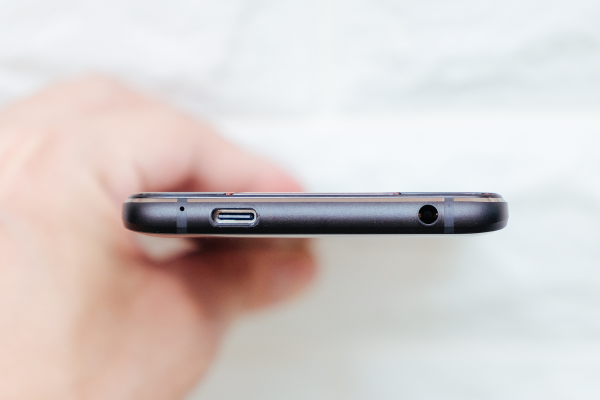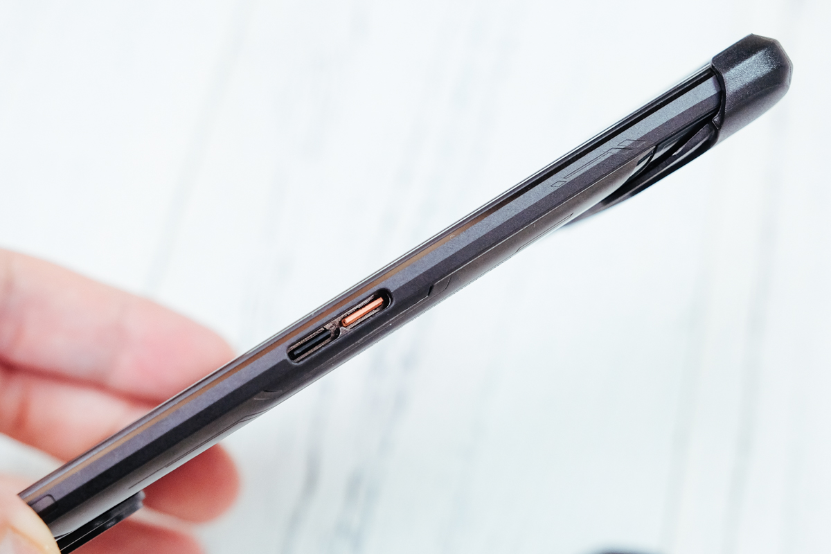 裝起來後二側的圓滑手感頗好握的,另外如果你在邊玩邊充電的時候,如果果線材也不想接在下方,那麼直接接在手機底部的連接埠其實也同樣很順手,因為 USB Type-C 連接埠不是在正中間,所以同樣不會卡手。