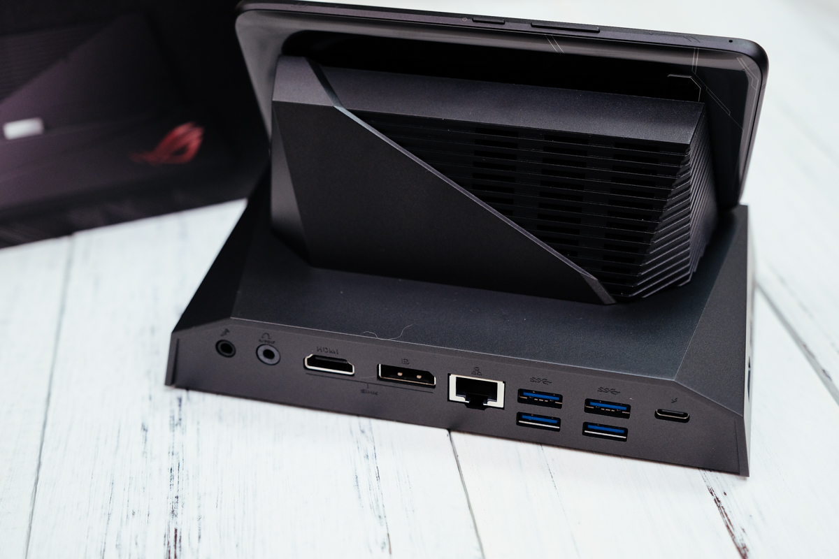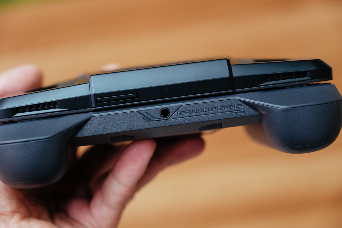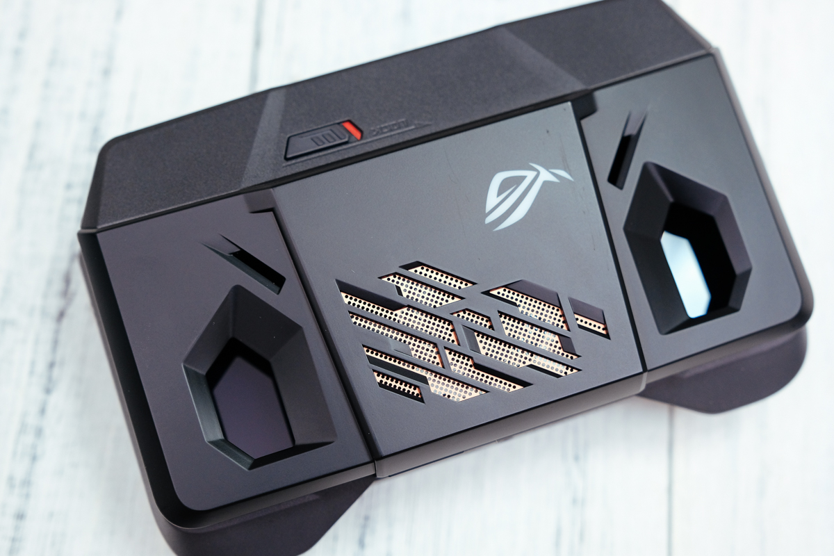 打開後在下方為第二螢幕,中間右邊為電源開關,上方不用阿湯介紹大家應該都看的出來是用來接上 ROG Phone 的,同樣是透過側邊連接插槽來接上去。