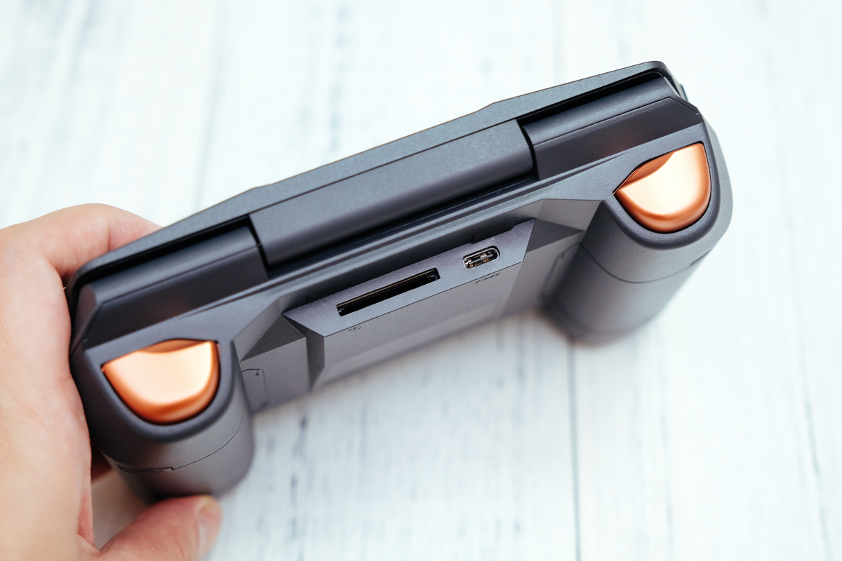 在握把的尾端有 L1 及 R1 實體按鍵設計,後方可接 SD 卡及 USB Type-C。