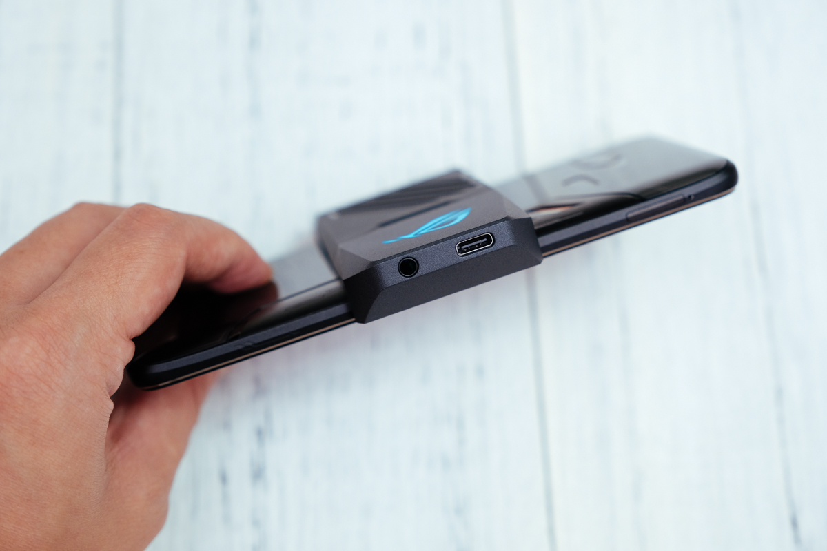 接下來就是大家最想看的配件部份,想像大家對於這麼一大咖行李箱裡裝的配件究竟有哪些都很好奇吧,厲害之處太快點破就沒有讓阿湯拿來說嘴的價值了,買大全配除了可以擁有 ROG Phone 限定登機行李箱外,剩下的就往下一個個來分享吧。 AeroActive 散熱風扇: 首先來看一下在 ROG Phone 本人那盒裡就附帶的配件,先回顧一下我們前面介紹到在手機側邊還有個擴充槽,這是一個 48Pin USB 3.0 Type-C 的側邊連接埠專屬插槽,這就是用來連接配件用的,其中第一個就是 AeroActive 散熱風扇,這個配件是只要買手機就原裝附贈,可以讓表面溫度降低 4.7 度,其實差很多。 註:就算不接配件使用,這側邊插槽(左孔)同樣可以接 USB Type-C 傳輸線進行充電哦。
