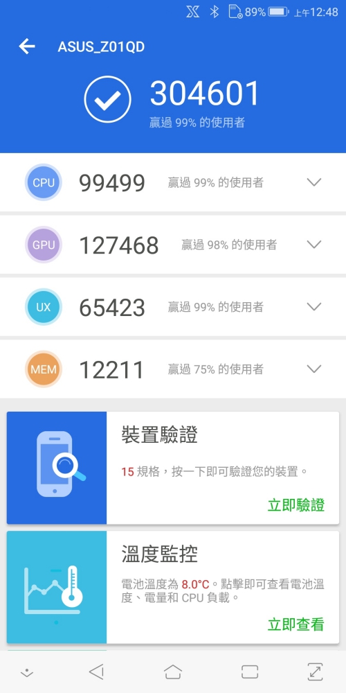 首先是安兔兔,S845 特規版加上 8GB 記憶體及 UFS 2.1 的 512GB ROM,讓安兔兔可以輕鬆的飆破 30 萬分,應該是目前的霸主了,也是目前市面上所有電競手機中效能最強勁的。