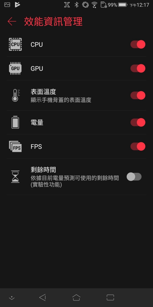 效能資訊,開啟後會在左上角顯示 CPU 使用率、GPU 使用率、表面溫度(手機背蓋的表面溫度)、電量、FPS 及預估可使用的剩餘時間(阿湯沒開這個所以沒顯示)。