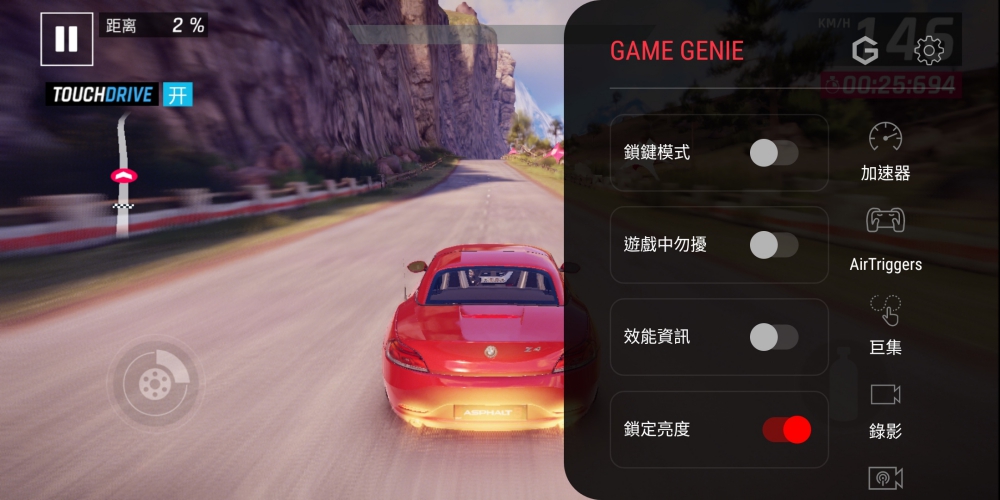當我們執行遊戲時,可以從導覽列上看到一個遊戲控制器的圖示,點擊後就可以開啟遊戲精靈,在 ROG Phone 的遊戲精靈裡多了部份新功能,阿湯也分別一一的介紹。 鎖鍵模式,開啟後會將導覽列隱藏,當你拉出導覽列時只會剩下遊戲精靈的按鈕,這是避免你在玩遊戲誤觸跳回桌面或退出等操作。