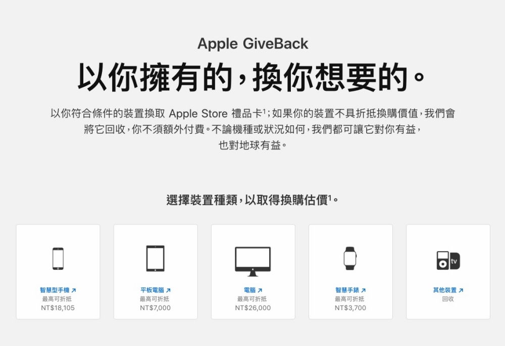 前幾天才剛發表全新的 iPhone 要上市了,雖然大家一直靠妖 5 萬多超貴,不過會靠妖的都不是買的人,所以不是很重要,因為一堆有錢人都下單了(不包含我),購買了新機之後,可能你舊機每一代都會留著紀念,可能你用不到就二手賣出補貼點新機的錢,但你知道蘋果官方有一個 Apple GiveBack 換購估價系統嗎?簡而言之,就是出錢買回你用不到的二手蘋果設備,包括手機、平板、電腦、手錶等各種設備,但估的價格其實真的不夠,但如果你的手機是已經壞了不打算修理,倒是可以考量回收估價看看,都比丟掉來的強。