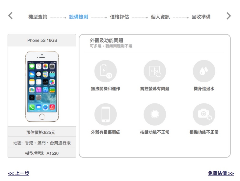 輸入機型後就會顯示回收價格預估為多少,像這 iPhone 5S 價格僅 825 元,相信大家如果手機還正常可以使用應該不會想要回收,如果手機已經無法開機使用也不想維修的話,可能也要往後新一點的手機才能有價格,像阿湯用 iPhone 5S 測試,不論選哪一個功能問題,都會變 0 元,但如果是 iPhone 7 或 8 我想應該還至少會有一點點價格吧。