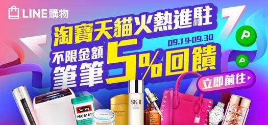 - 活動說明:9 月 26 日週三淘寶日,用戶透過「LINE 購物」前往淘寶天貓完成消費,每筆消費不限金額,都能夠獲得雙倍的 LINE Points,單筆回饋無上限!也就是說如果在活動期間購買任何一個淘寶商品,本來能夠獲得 LINE Points 5% 點數,在週三淘寶天貓日這一天則能夠獲得 LINE Points 10% 回饋!