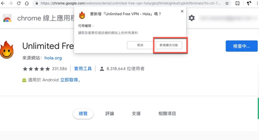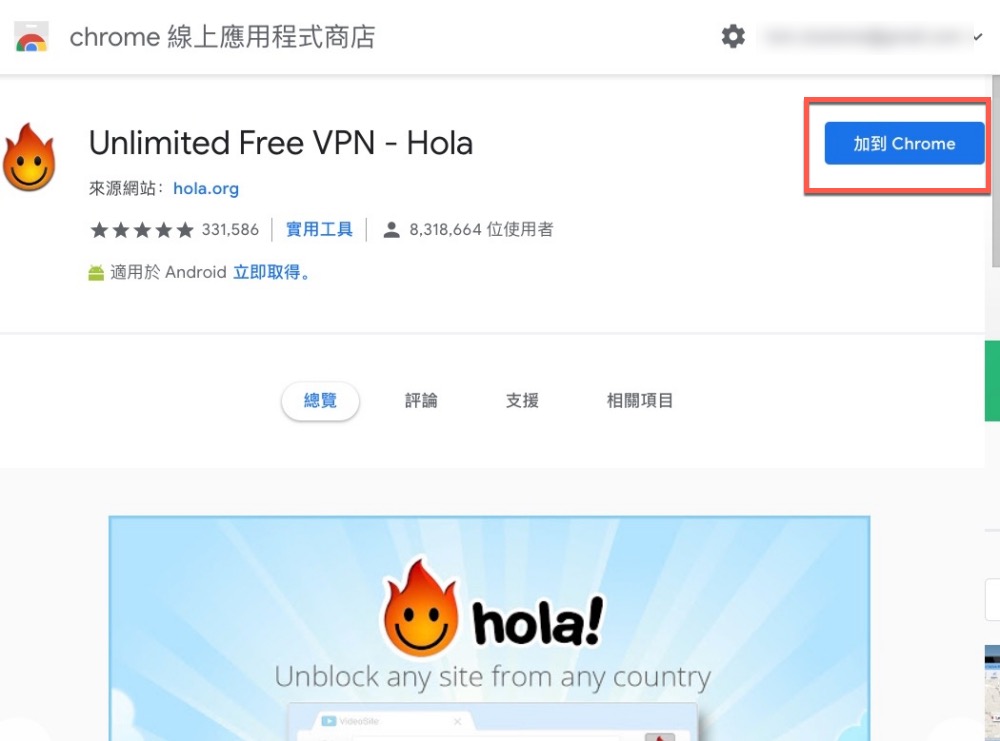我們就來解決下載連結無法瀏覽這件事,簡單的說只要找個免費的 VPN 可以跨區出去就好,比如像這是阿湯很久以前就分享過的老牌 VPN 工具 Hola,有 Chrome 的套件可以直接用,進到頁面後點擊「加到 Chrome」。