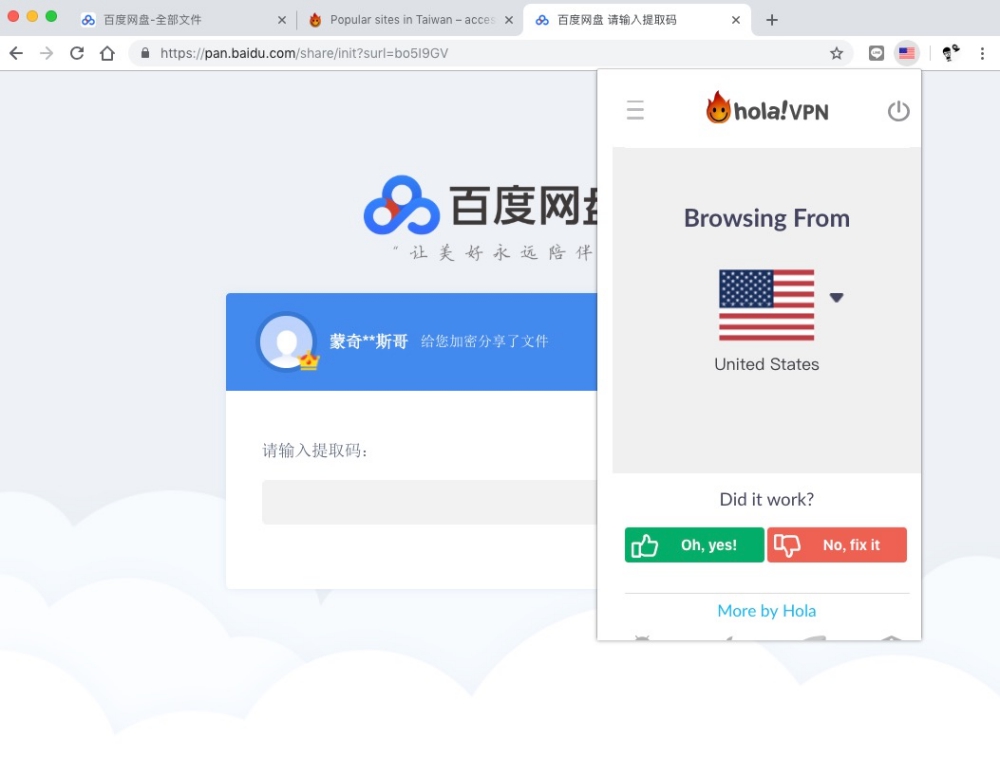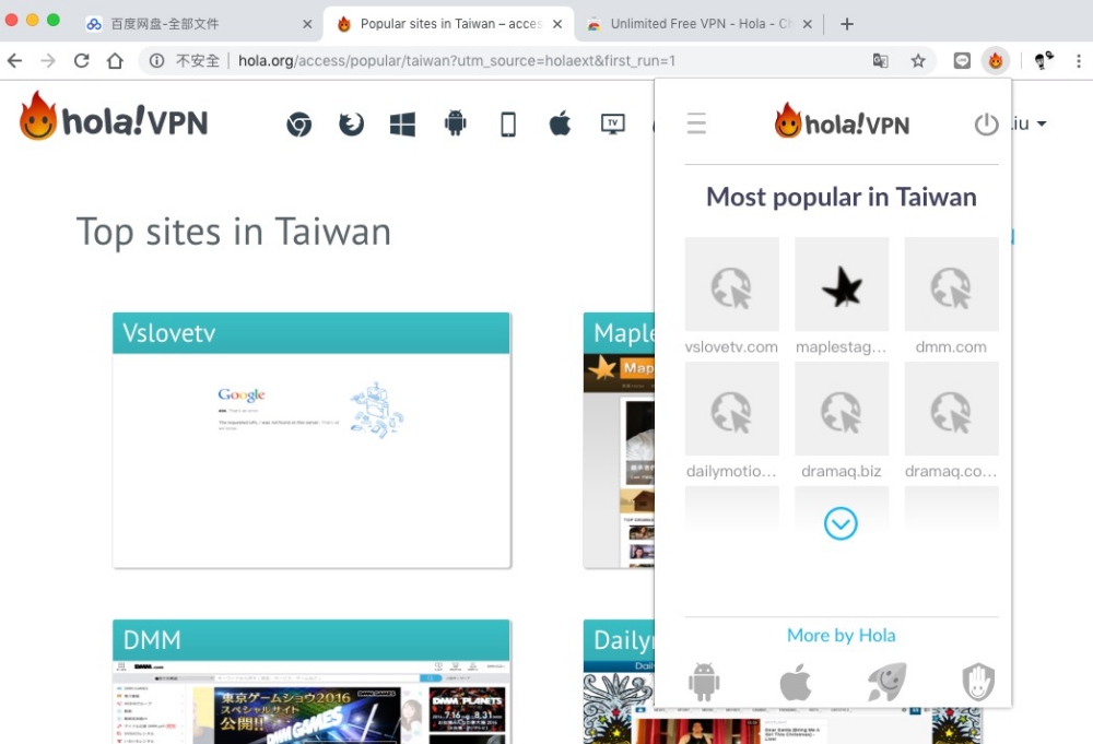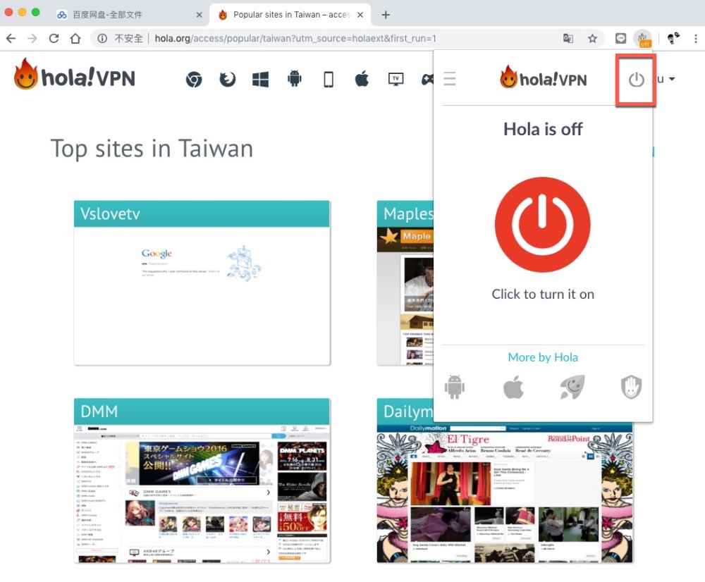 如果要斷開 hola VPN,右上角就有開關,操作很簡單。