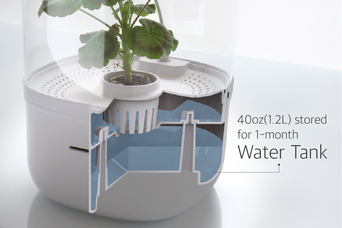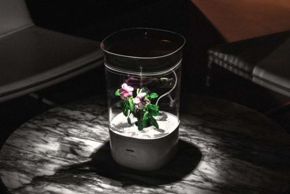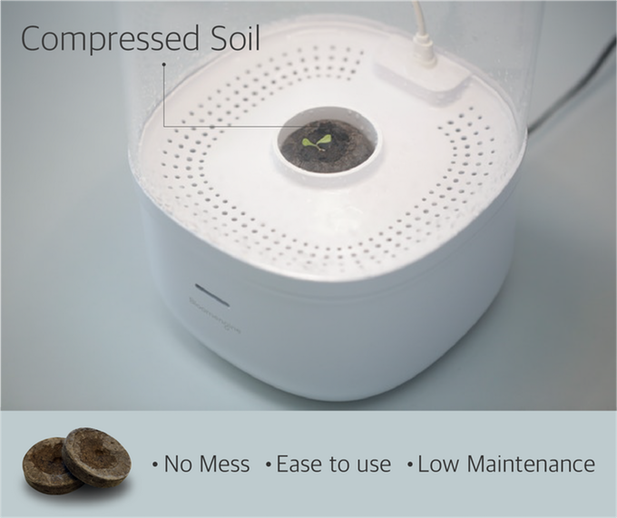 智慧溫室 Bloomengine 是一個像是小檯燈一樣的外型,底部可以儲水、上方有 LED 燈光、中央凹槽是可以放置用水就還原的壓縮土壤,溫室中更設計了排風扇能夠給植物最舒服的溫度和環境,也能讓開花後的香味馨香傳出,用戶甚至還能透過頂部的觸控按鈕來調整情境或是水孔設計來模擬下雨般的為植物進行補水。