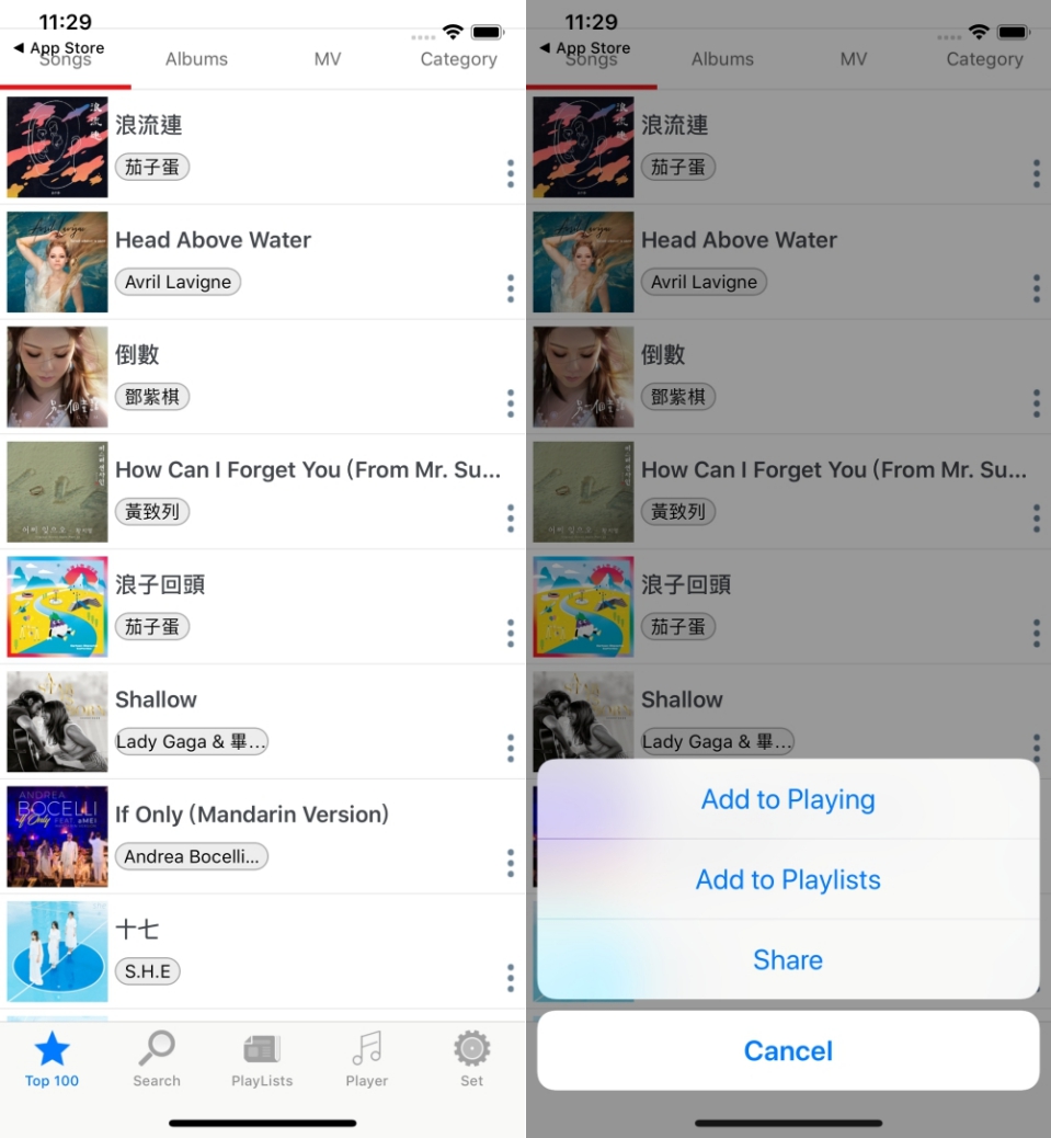 其實這個 APP 不太需要我教你,應該簡單到一看就會用,比較特別的是,在第一個類別裡還有 TOP 100 可以選擇,這 TOP 100 應該是依據大家使用這 APP 時加入的內容來排名的,而且有區分台灣排名(應該是,在設定裡有選擇國家),看到想聽的歌就只要在右邊方的選單鍵(三個點)按一下後選擇要直接加入播放,還是建立播放清單。
