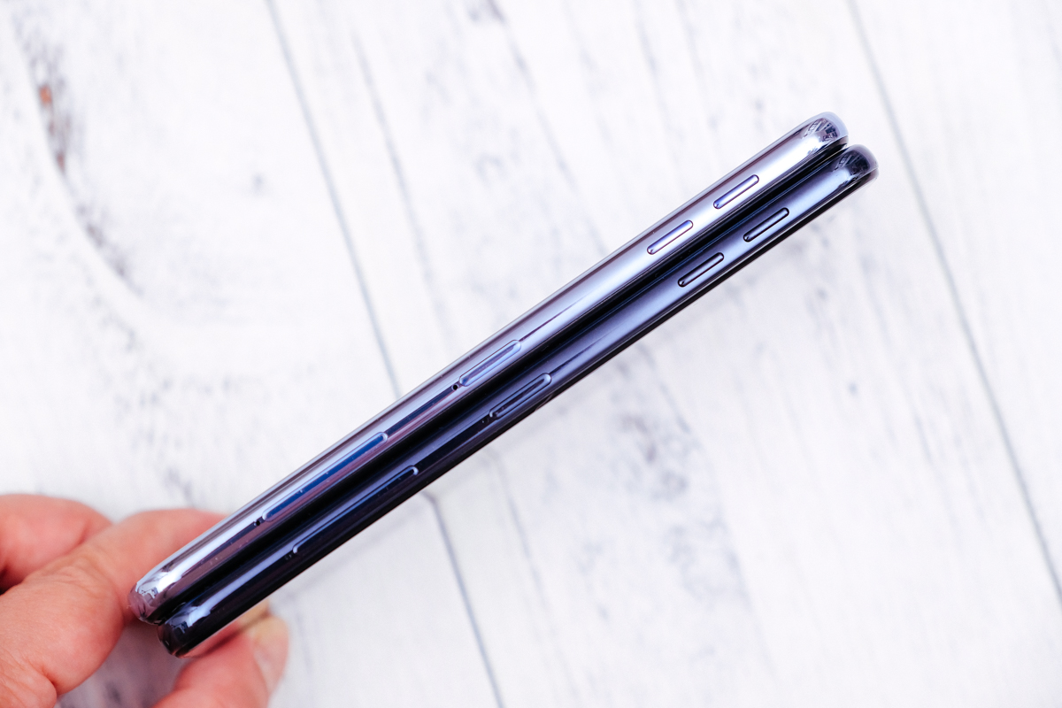 側邊為喇叭及電源鍵分別位於手機右側邊,比較特別的是 Galaxy J6+ 支援側邊指紋辨識,並與電源鍵設計在一起,喚醒手機的同時就可以順便以指紋解鎖,而 Galaxy J4+ 則是支援臉部辨識。