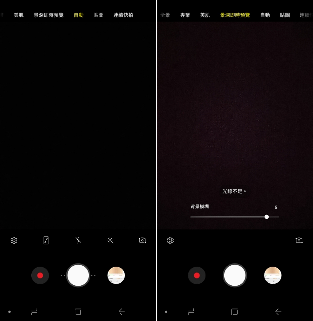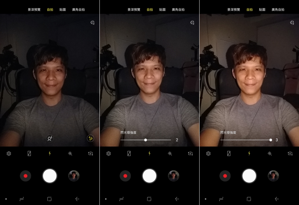 在昏暗場景下,通常自拍出來的畫質都是慘不忍睹,沒啥好說的,不過在 Galaxy J6+ 或 Galaxy J4+ 都支援可調式三段鎂光燈,補光燈的亮度可以依現場環境自己調整,三段強度在全暗的房間下大概是有這樣的差異。