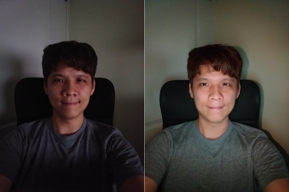 阿湯也實測有沒有開鎂光燈自拍,左圖是只全暗房下,只靠著電腦螢幕的微弱光線所拍攝,而右邊是開啟 3 段鎂光燈所拍攝,成像差很多,而且當你使用補光燈時,螢幕也會進行補光,讓你自拍起來人臉不會因為鎂光燈的直射太過死白,自拍補光也能有自然的臉色。