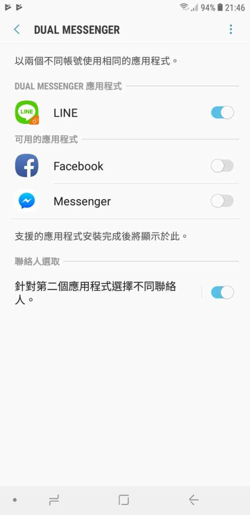 而在 Samsung 系列的手機中,最特別的就是可以在同一台手機中登入三個帳號,比如 LINE 或 FB,其他應用程式最少都可以登入二個不同的帳號,以內建的 DUAL Messenger 來說,支援部份的社群 APP,像是 FB 及 LINE 就有支援,開啟後就會有二個 APP 可以獨立使用。