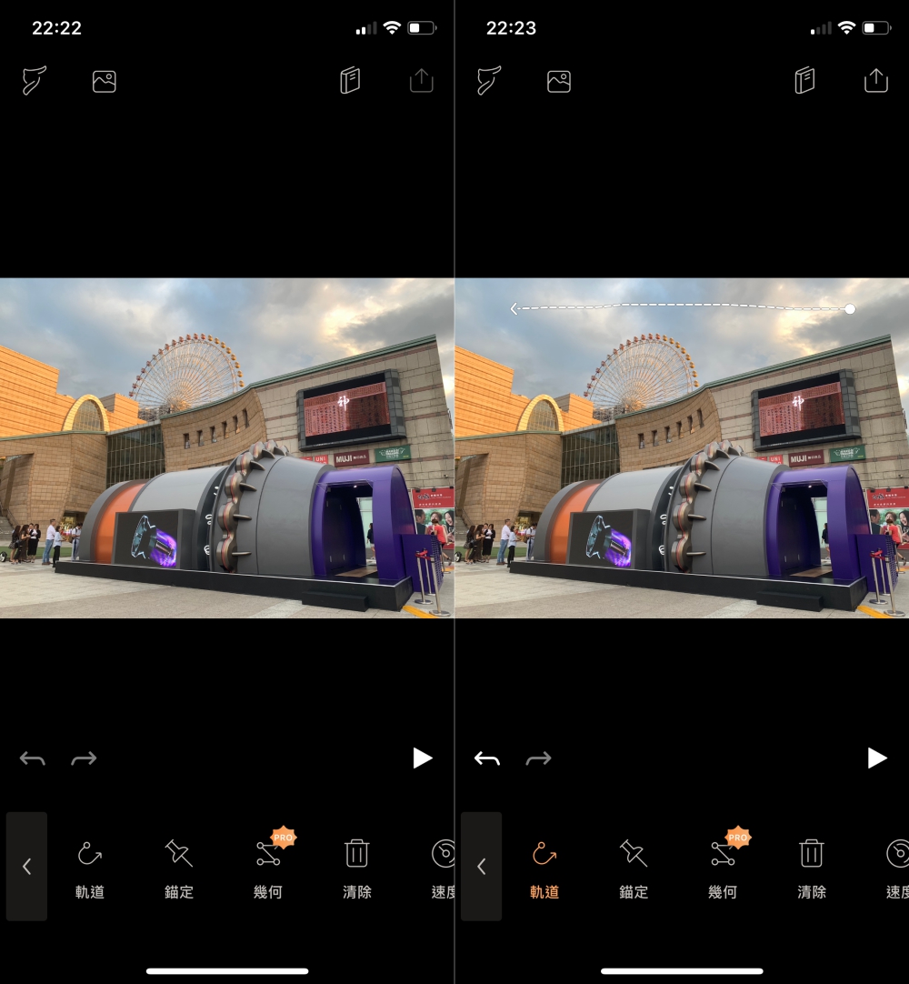 首先就是選擇軌道後,在要動起來的地方畫路徑,阿湯以天空為例,比如要由右往左飄動,就直接由右往左劃一條,也提醒大家,這種動態的內容盡量要選擇簡單一點的東西才能做的好看。像是天空、水流,或者旋轉的東西。