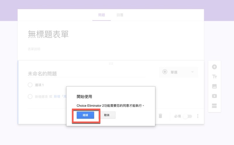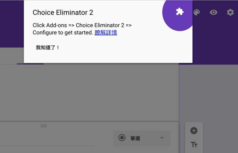 在設計 Google 表單時,右上角外掛程式裡就可以看到多了一個「Choice Eliminator 2」可以選擇。