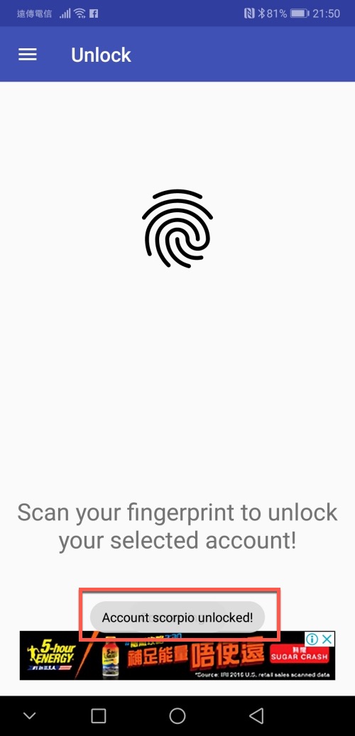 手機上進入「Unlock」頁面後,按壓指紋,看到下方 unlocked 就是成功囉,就會看到電腦也登入成功。