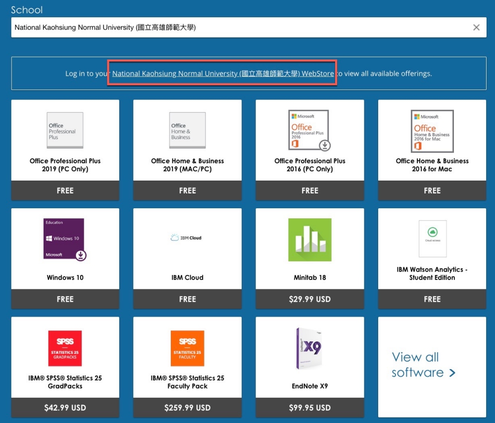 如果有搜到你的學校那就可以往下進行,搜到的同時在下方也會顯示有哪些項目是免費的,不過基本上 Office 跟 Windows 都一定是免費,再來請點擊 Log in to your 學校那一串。
