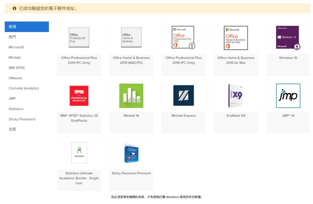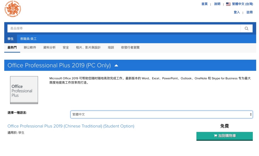 這麼一來就會進到你的學校專屬的區域,可以看到有提供哪些軟體可以下載使用,阿湯是建議也不用急著全部免費的都一次下載,有需要時再來取得序號也行,我們可以先隨便點擊一個進去看看,比如 Office Professional Plus 2019。