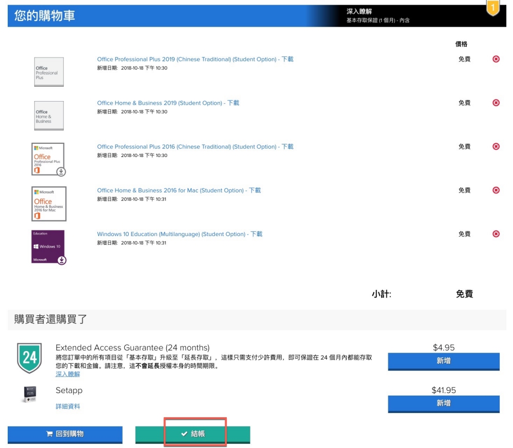 加完之後可以看到全顯示免費,就可以進入結帳。